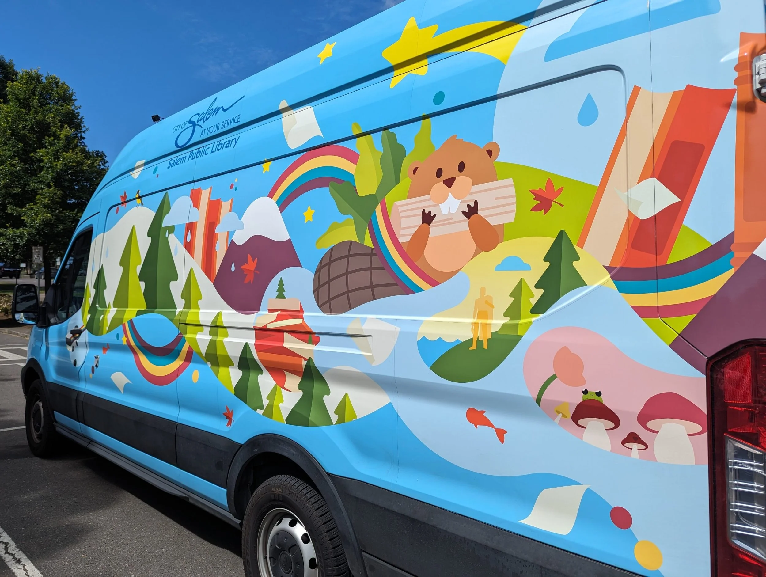 In unison with !Porque¡ Creative Agency, the Salem Public Library (SPL) committee’s goal was to revitalize their long standing outreach van with a new look and feel. This custom illustration encompasses the optimistic future and landmarks of Salem, Oregon. We received design feedback not only from SPL but also the Salem community.