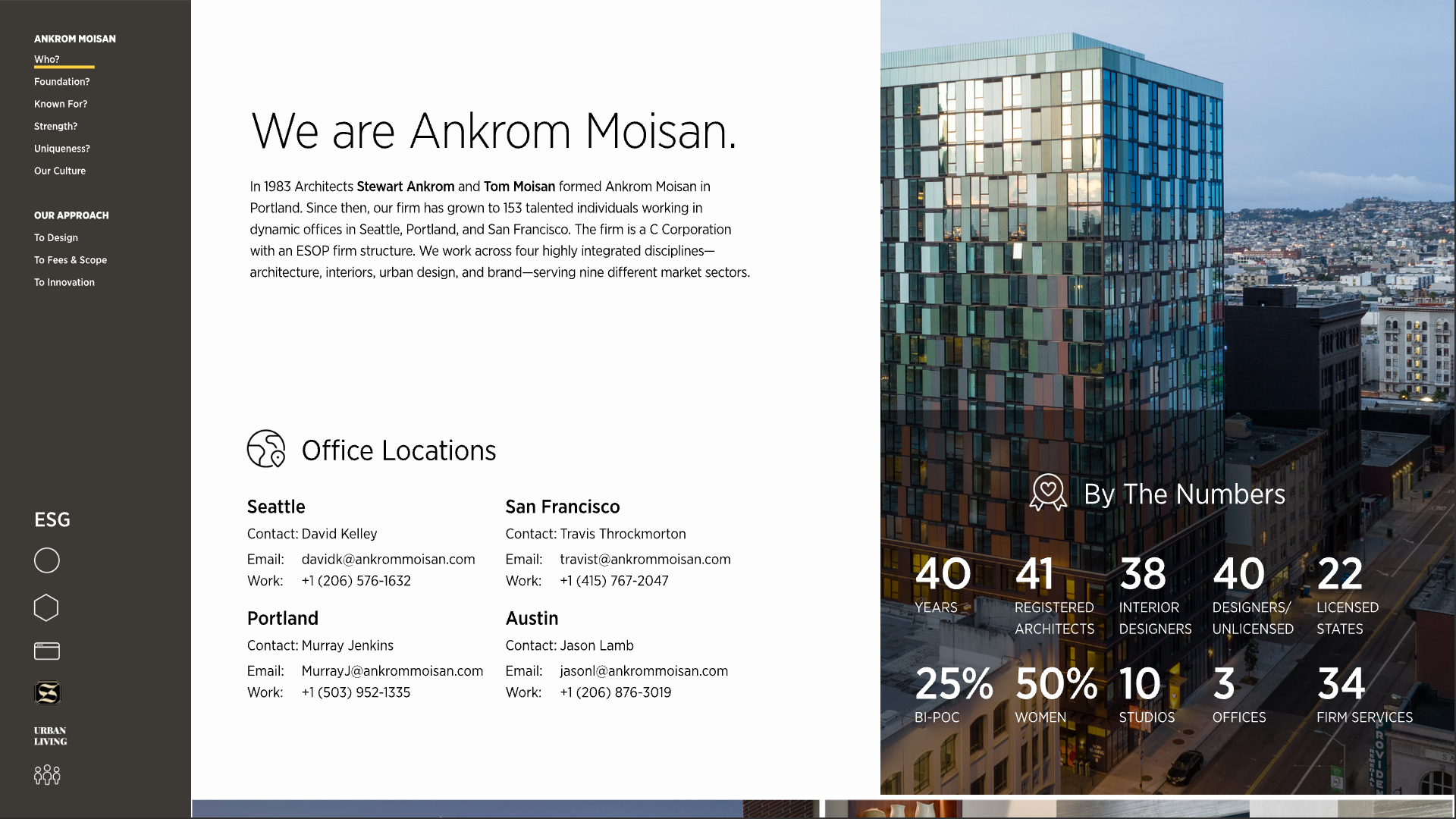 By utilizing InDesign and In5, we were able to create an interactive PDF for external client meetings that bridged the gap between a website and a PDF. While maintaining brand standards, we built a unique and one of a kind deck that kept Ankrom Moisan’s architects and interior designers introduction-ready for any occasion.
