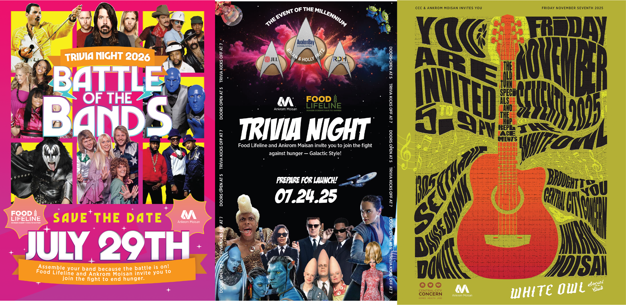 3rd year leading digital and print collateral for both Trivia Night by Food Lifeline in Seattle Washington and jAM by Central City Concern in Portland Oregon.