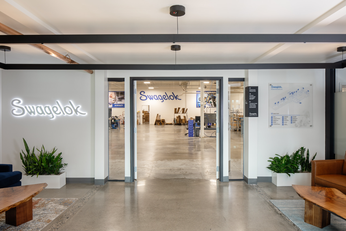 Balancing Swagelok’s existing brand with the regional look and feel of the Pacific Northwest, new signs and graphics were developed for both the interior and exterior of their new Milwaukie location.