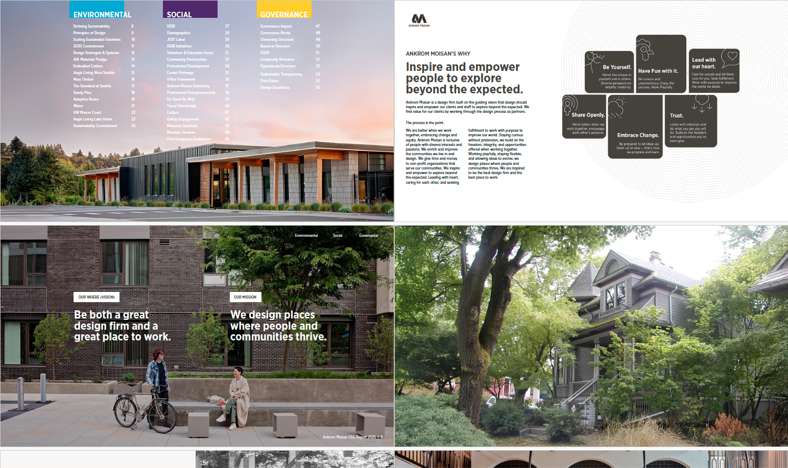 The first of if its kind in Ankrom Moisan history, I had the pleasure of creating the framework and design direction for their first ESG Report.